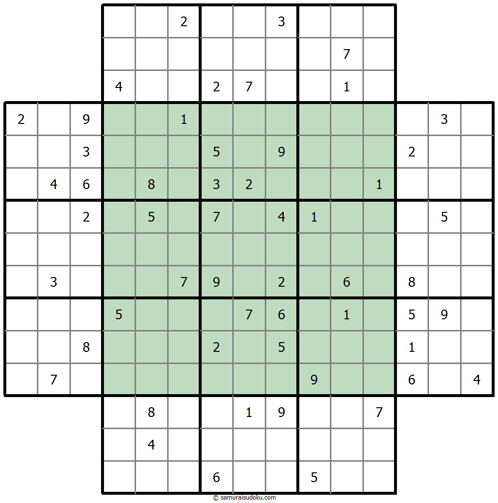 • Flower Sudoku has five sudoku puzzles in layout, similar to Samurai Sudoku. However, these puzzles overlap each other much more than in Samurai. The center grid is fully covered by the remaining four sub-puzzles.